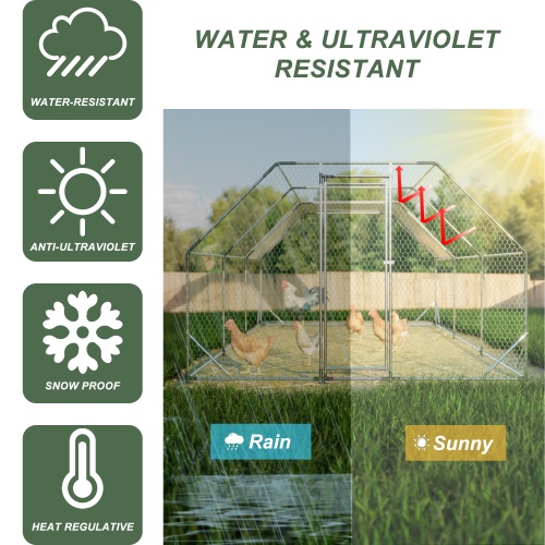 - A durable UV and water-resistant tarp can protect your chicken from the weather and outside elements. The pitched roof allows water, debris, and light snow to easily run off instead of accumulating.