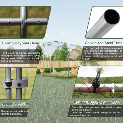 - Featuring galvanized coop, robust steel tubes with eco-friendly power coating finishing, guaranteed to last for years. The coating is protective and resists rust, corrosion, and fading so that the coop is weatherproof and of great durability.