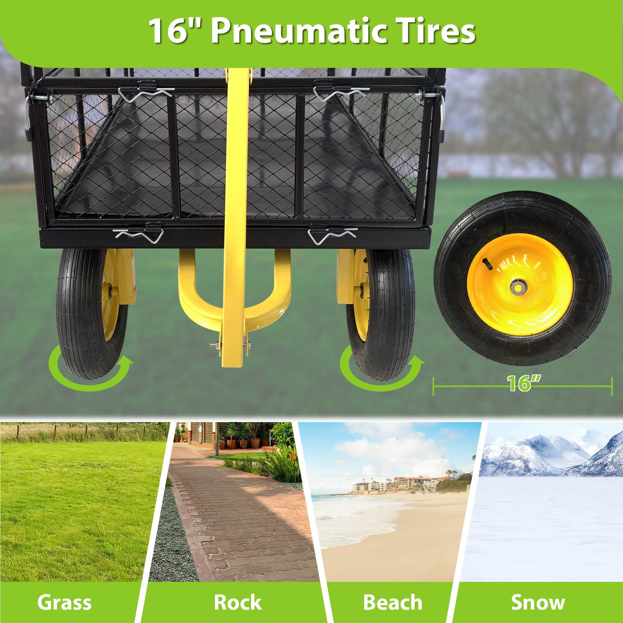 - The King of Terrain: Our garden cart flatbed is equipped with 16-inch tires, enhancing stability and security during use. The upgraded pneumatic tires feature noise-reduction and shock absorption. These impact-proof tires ensure the garden cart adapts to various road conditions, such as grass, snow, beaches, rock, etc. Get ready to roll over any surface and go where you need to be!